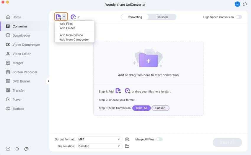 После запуска Wondershare 4K Player на вашем Mac выберите инструмент Видео конвертер, а затем перетащите свои фильмы 4K в окно. Либо нажмите на одну из двух кнопок в верхнем левом углу, чтобы импортировать фильмы 4K с локального диска или оптического диска.