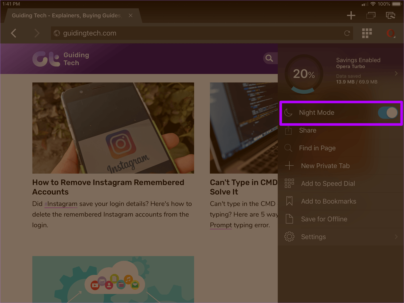 Но это не конец истории — Opera Mini предоставляет отличную функцию ночного режима, которая, в отличие от других браузеров, затемняет экран, а не отображает веб-страницы в черном цвете. Чтобы включить его, нажмите ползунок рядом с «Ночной режим» в меню «Опера».
