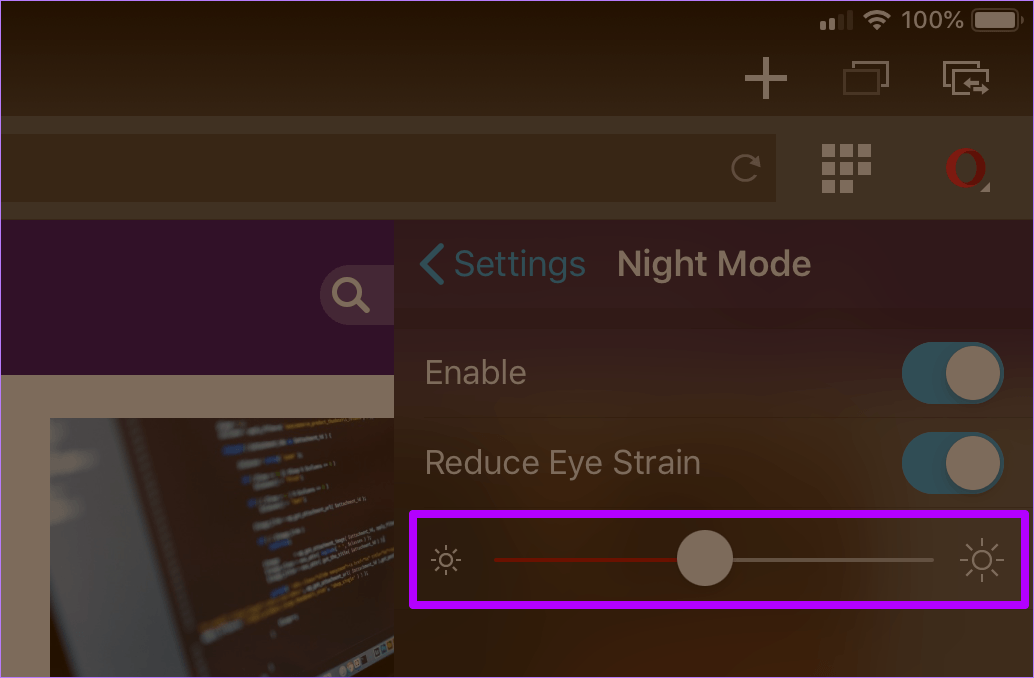 Кроме того, браузер также позволяет использовать изящный слайдер Eye Strain для активного управления уровнем бликов на экране — сродни ночной смене iOS, но чуть теплее. Вы можете получить доступ к слайдеру, коснувшись параметра «Ночной режим» в настройках Opera Mini.