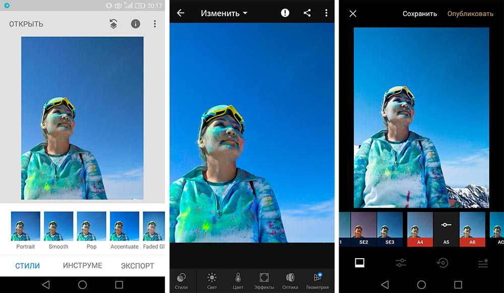 Приложениям для фото и видеосъемки мы посвятим отдельный материал, потому что в одном абзаце в данном случае тему не раскроешь. Но хочется отметить, что мобильных программ сегодня очень много, особенно для фото. Обработка, съемка в RAW, графика, эффекты, все это уже есть. Одна из самых популярных программ для обработки на сегодня это Snapseed. Очень мощный инструмент в умелых руках, который позволит и базовую коррекцию провести и сделать глубокий тюнинг снимка. Отличное приложение для эффектов Lens Distortions, а еще есть Lightroom, Pixlr, PicsArt, VSCO, Lenka и еще пара десятков прекрасных программ.
