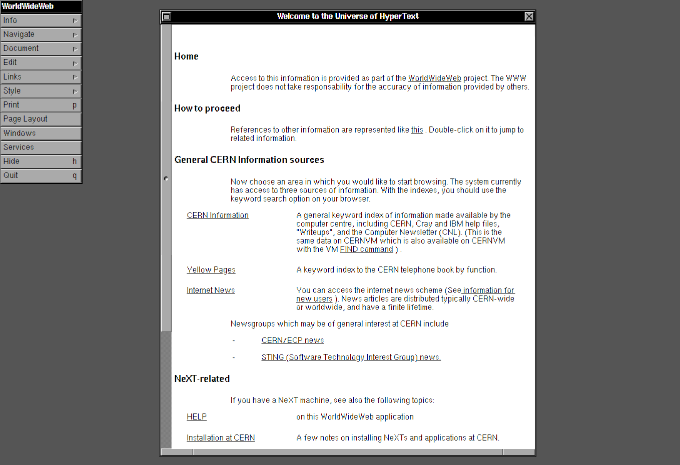 Первый сайт info.cern.ch в первом браузере WorldWideWeb