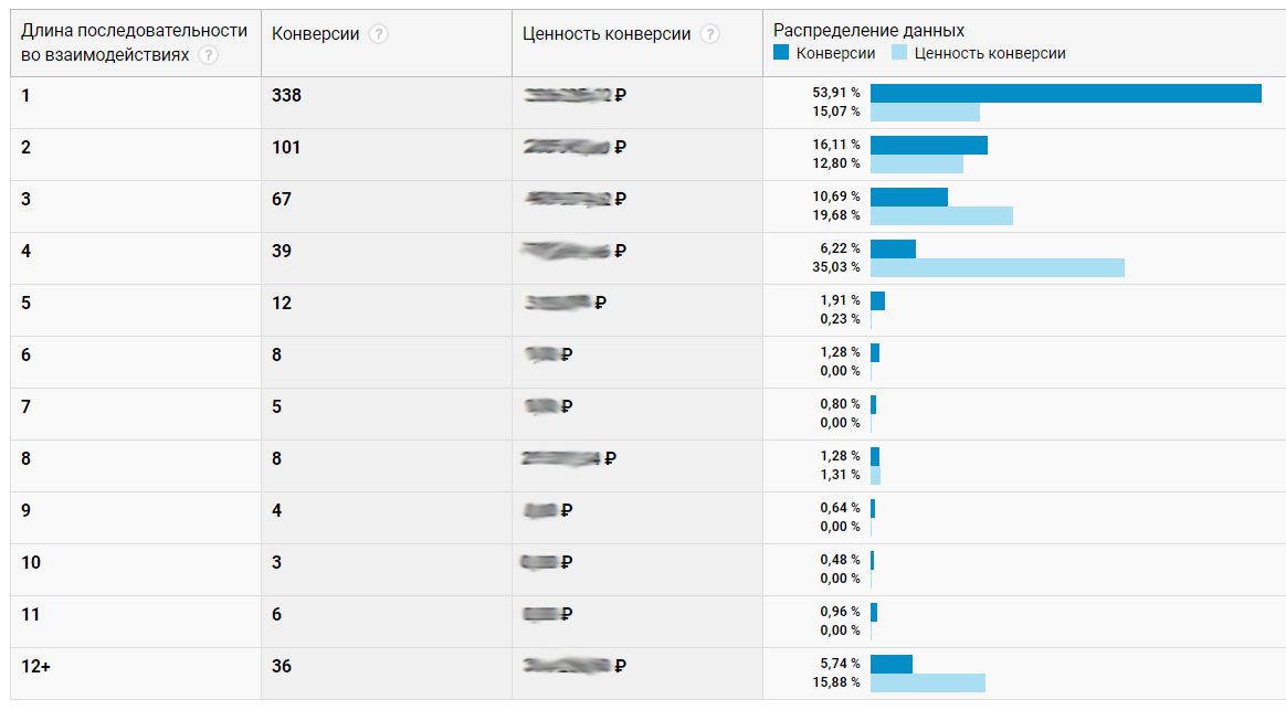 На скриншоте видно, что самые ценные конверсии сделали посетители, которые взаимодействовали с сайтом 3, 4, 12 и более раз