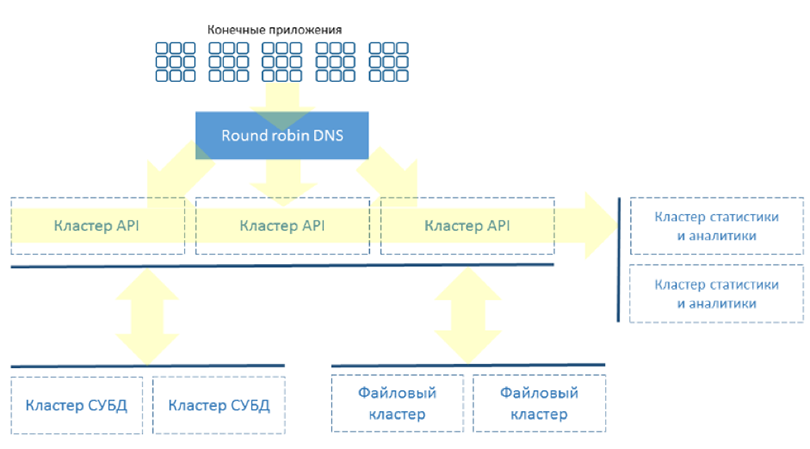 Принцип работы backend-платформы Scorocode предельно прост: существующие приложения обращаются к одному round robin DNS, который дальше распределяет поступившие обращения по кластерам. Кластерный API, в свою очередь, распределяет запросы на СУБД, обеспечивая связь «многие ко многим». При этом несколько API-серверов могут обращаться к нескольким серверам СУБД, что обуславливает независимую горизонтальную масштабируемость.