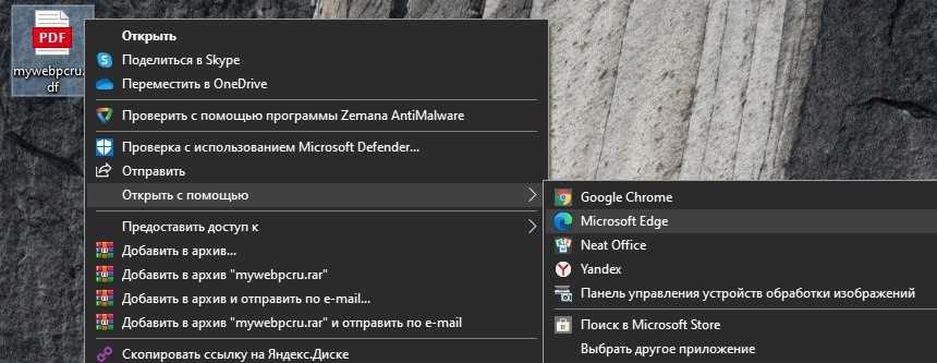 Шаг 1. Нажмите правой кнопкой мышки по PDF файлу и выберите открыть с помощью браузера Microsoft Edge. Также, можно просто перетащить файл мышкой в окно браузера Edge.