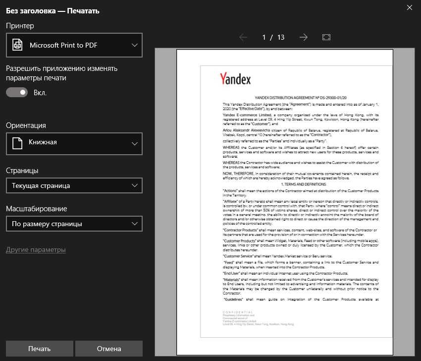 Шаг 4. Если у вас первый лист начинается не так как в самом файле PDF, то перетяните еще чуть выше заголовка (смотрите Шаг 2). Если вас все устраивает, то нажмите «Печатать». Выберите место для сохранения PDF файла, подождите немного и вы его сможете открыть по указанному пути сохранения.