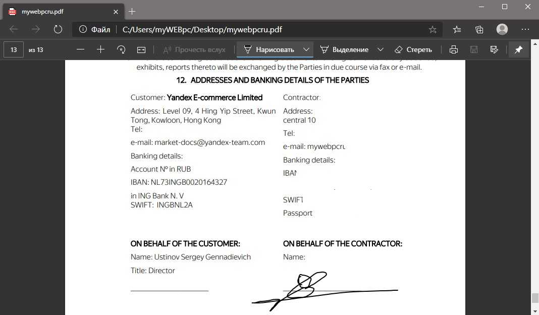 Шаг 2. В браузере Edge появляется сверху бар, в котором нажмите на иконку карандаша «Нарисовать». Выберите цвет, толщину линии, если нужно, и подпишите контракт в PDF формате. Нажмите на иконку дискеты сверху справа, чтобы сохранить изменения, которые будут перезаписаны в текущий файл.