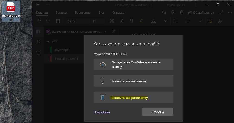 Шаг 1. Напишите в поиске Windows 10 «OneNote» и запустите приложение. Перетяните файл PDF в окно OneNote и выберите «Вставить как распечатку».