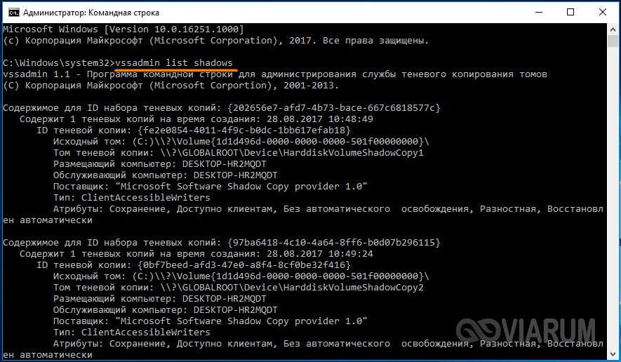 Обратите внимание на параметр «Исходный том», в нём будет указана буква диска, с которого вы собираетесь восстанавливать данные. Затем, определив номер резервной копии (он указан в конце значения параметра «Том теневой копии»), выполните команду следующего вида: