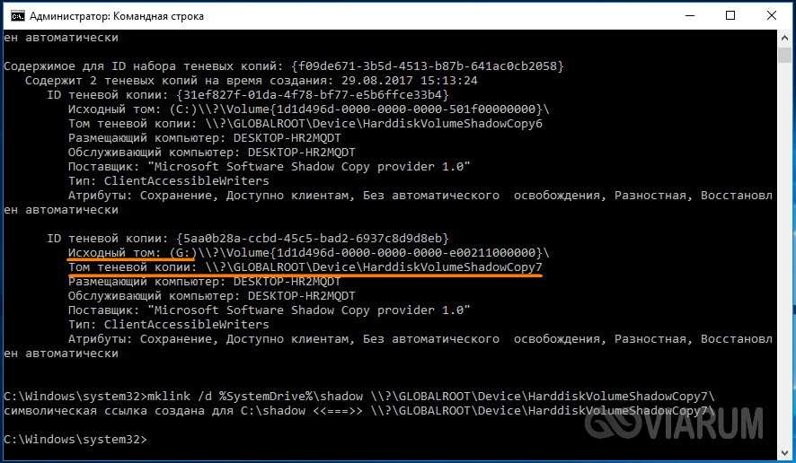 В данном примере точка восстановления имеет номер 7, у вас значение будет другим. В результате выполнения команды в корне диска С появится символическая ссылка shadow.