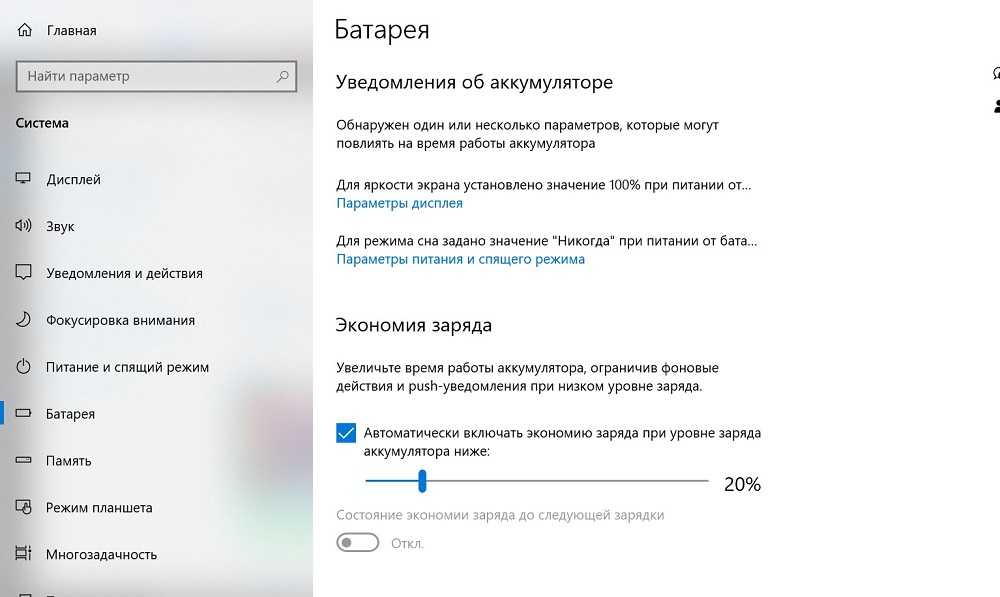 Чтобы этого избежать, в Windows 10 есть режим “Экономия заряда”. Если его настроить, к примеру, на 20%, то он каждый раз будет вас предупреждать, что ноутбук разрядился и необходимо его подключить к сети. Это удобно, если вы увлеченно работаете или играете. Настроить режим очень просто. Заходите Пуск — Параметры — Система — Батарея. Прокручиваете немного вниз и увидите данный режим. Устанавливаете нужный порог зарядки и получаете уведомления. Там даже можете почитать советы по экономии заряда от Microsoft.