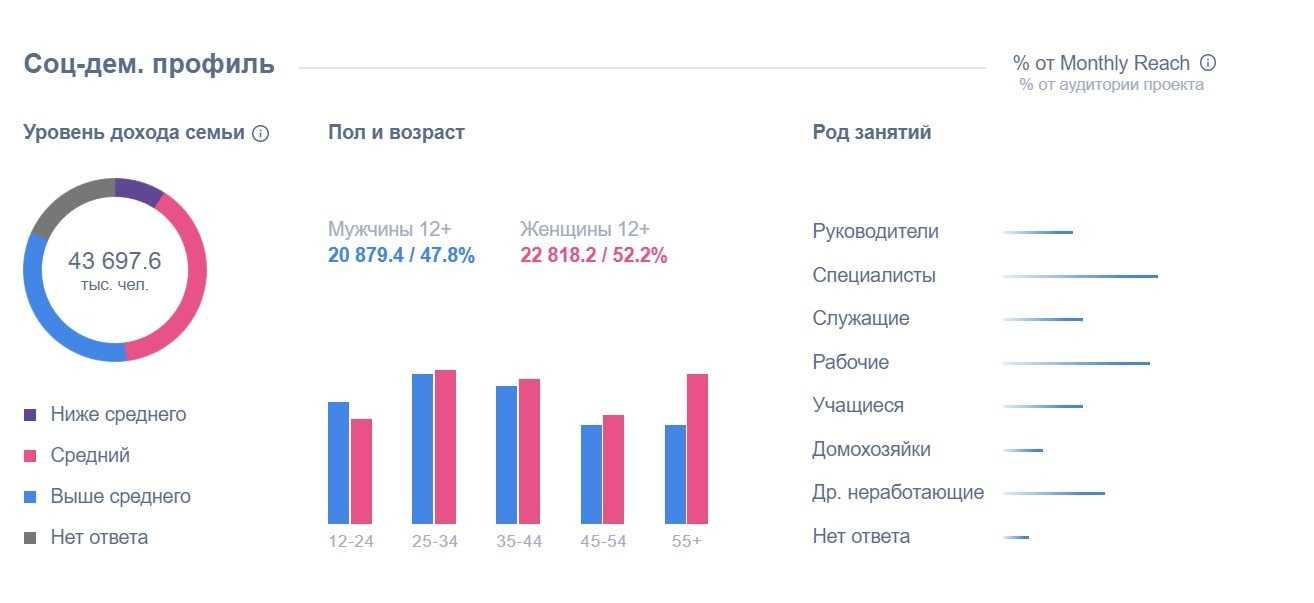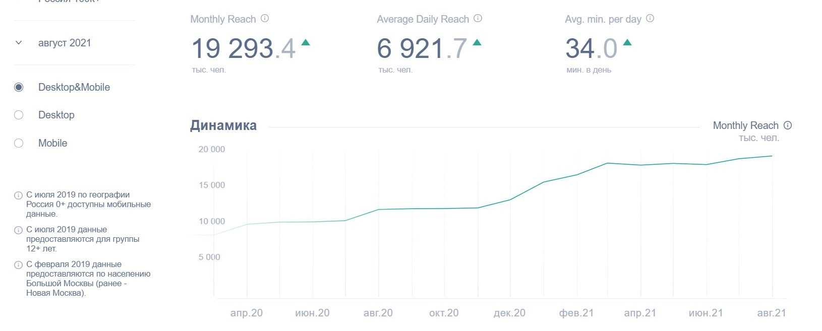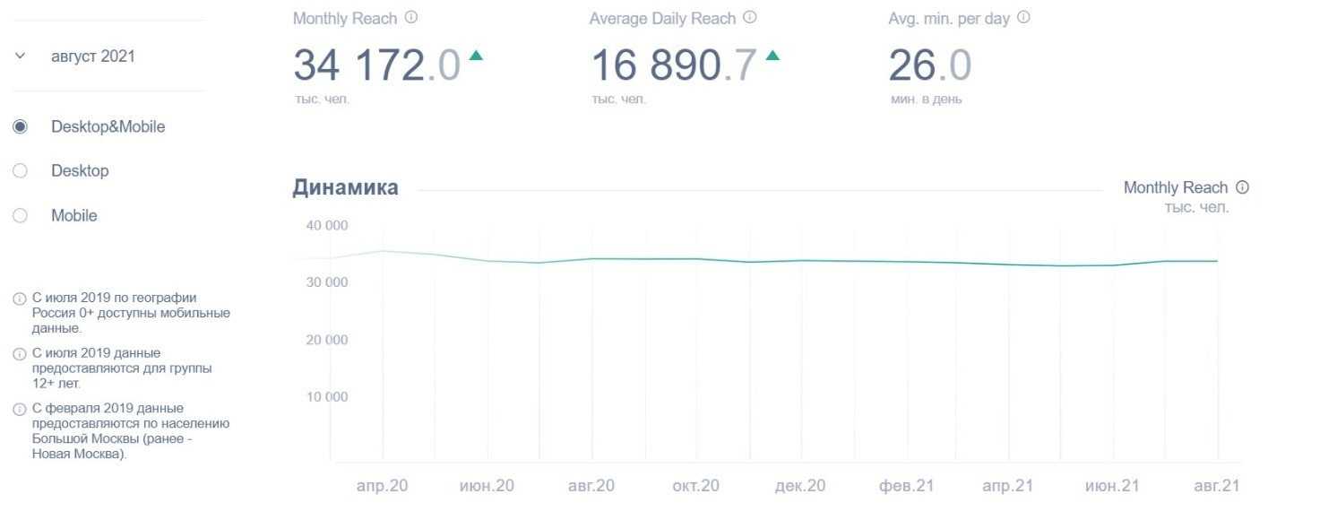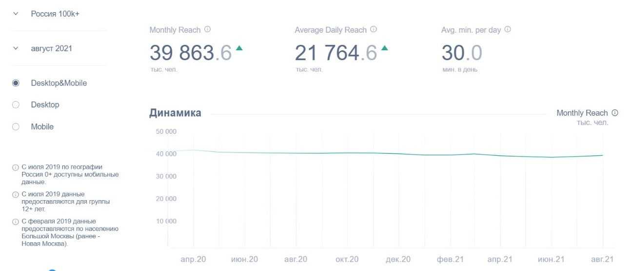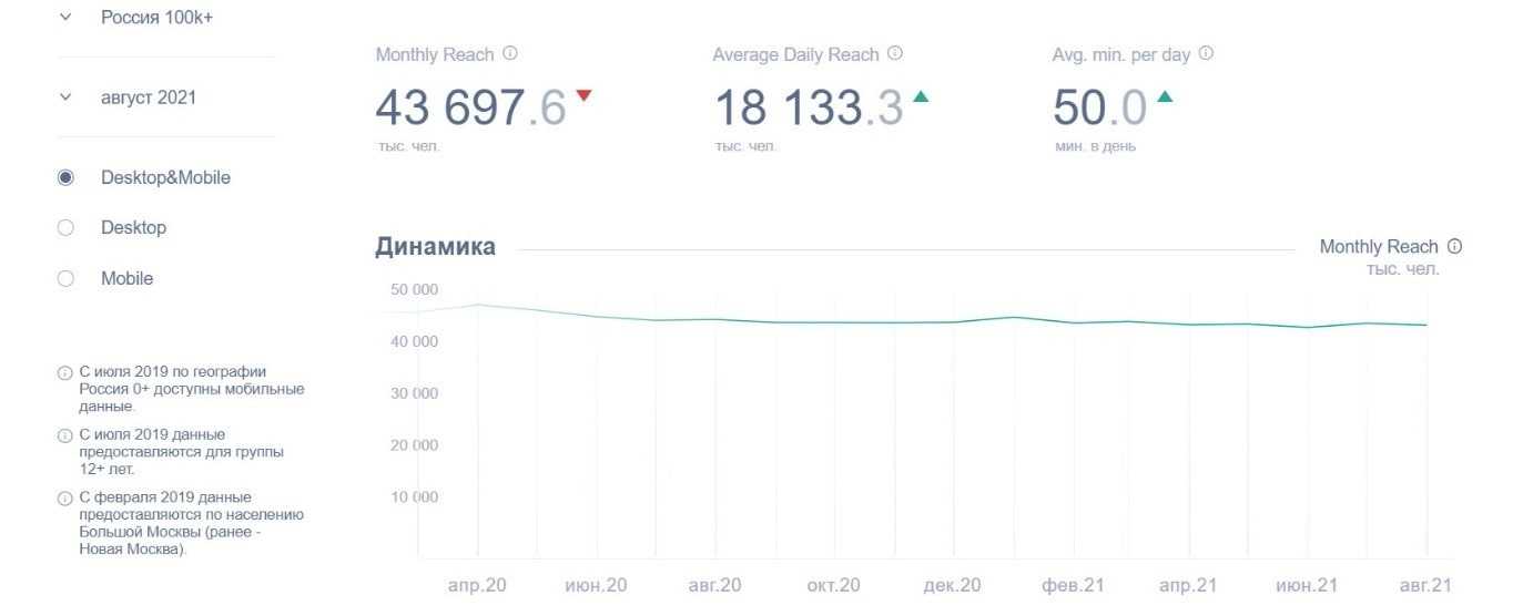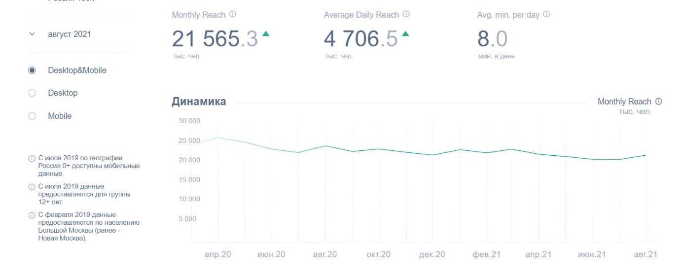 Ежемесячный охват в августе 2021 года, по оценке Mediascope, составил около