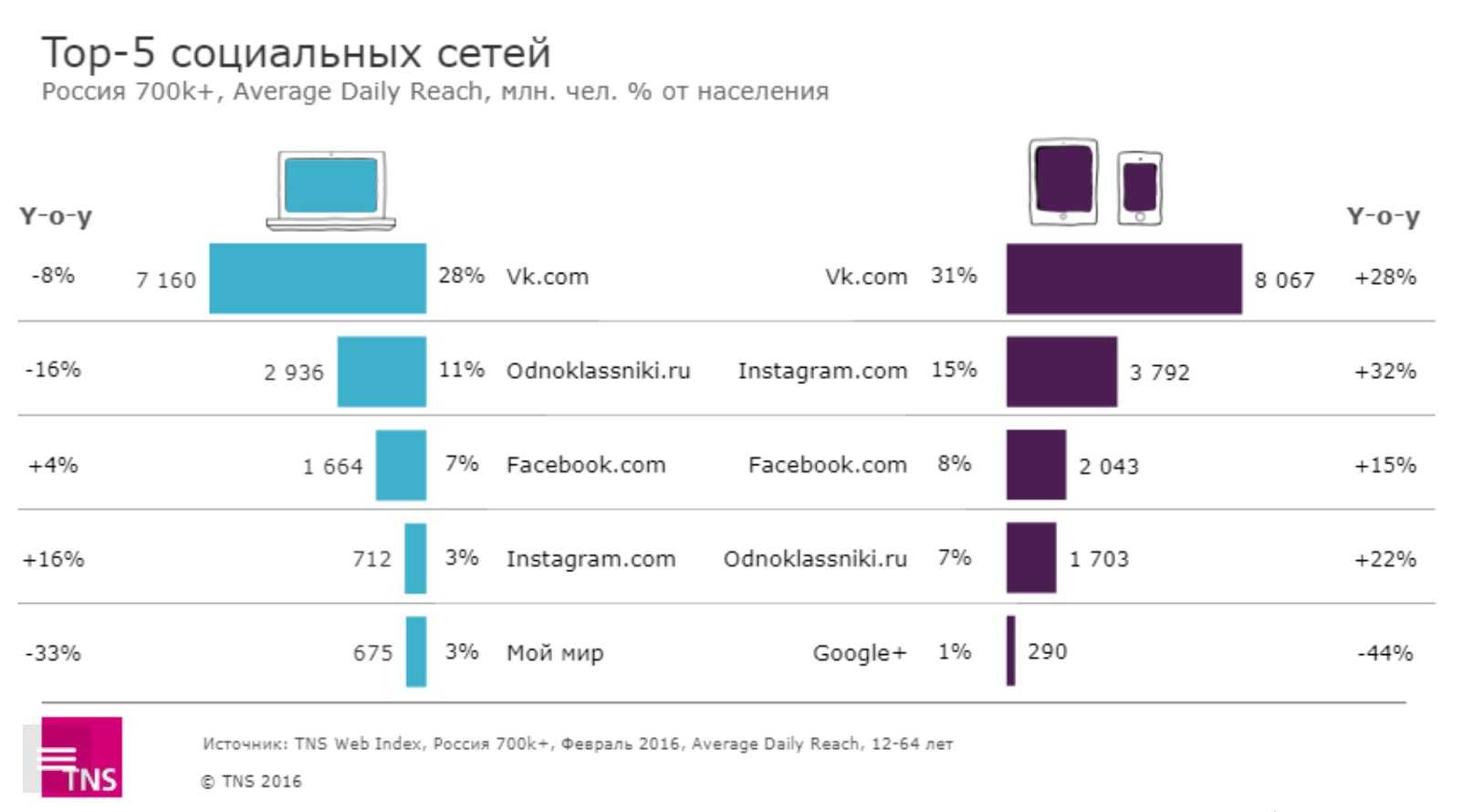 Популярность Инстаграма растёт быстрее, чем у других соцсетей.Число российских пользователей Фейсбука также увеличивается, особенно в области деловых контактов и бизнеса: 30% сообщений, связанных с бизнесом, появились в Фейсбуке. А вот Твиттером пользуются всё меньше.