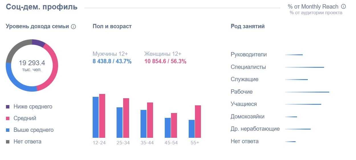всего тех, у кого средний доход (41% от ежемесячного охвата), далее —