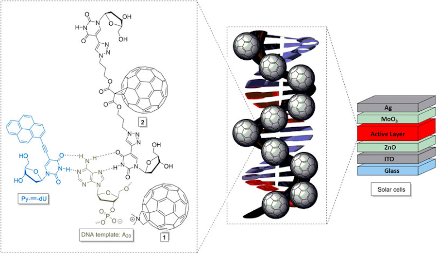 Основа системы — фуллерен, «футбольный мяч» из 60 атомов углерода. К нему крепится краситель, который поглощает солнечный свет и отдает получившуюся энергию фуллерену. Но возникает проблема: если не упорядочить такие супрамолекулы, ток между ними будет протекать с трудом, а со временем и вовсе затухнет.