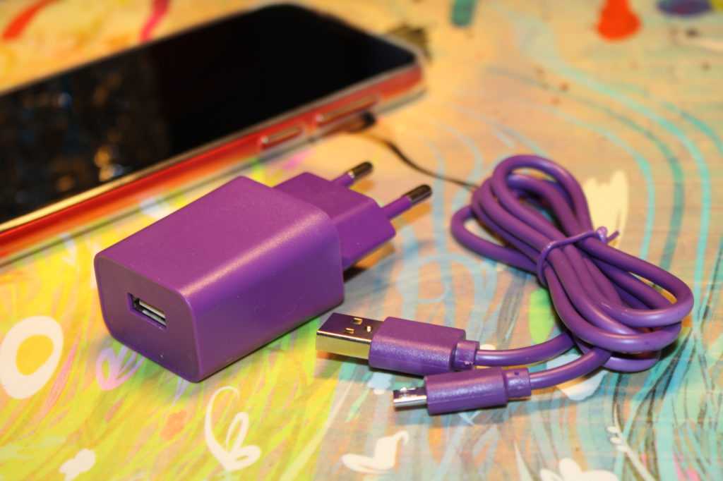 В комплект поставки входит сам смартфон, защитный силиконовый чехол с ярким принтом, зарядное устройство и кабель USB фирменного фиолетового цвета, руководство пользователя и листовки с подписками, о которых мы расскажем дальше.