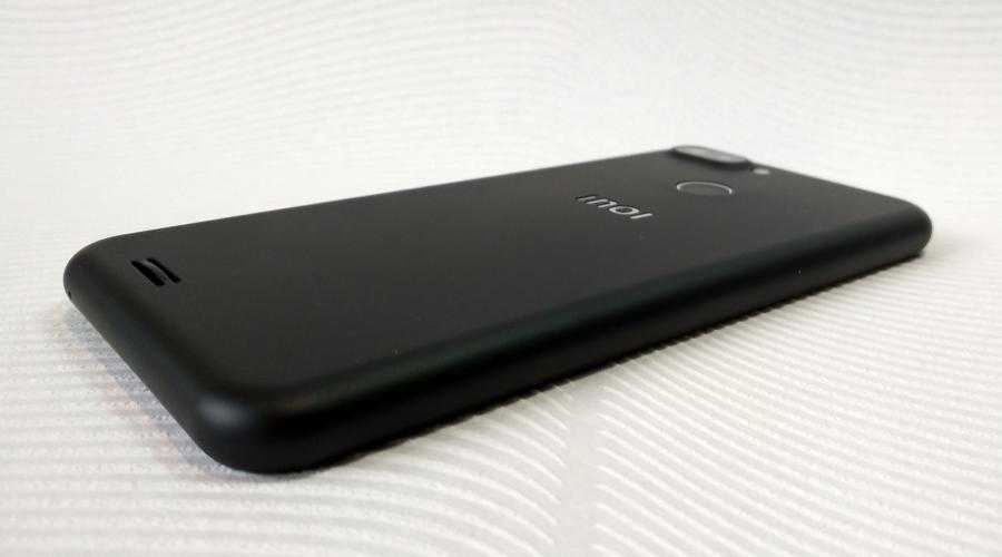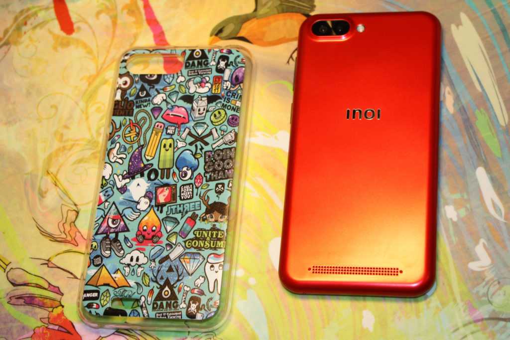 На задней крышке в левом верхнем углу расположен слегка выступающий двойной модуль камеры, рядом LED-вспышка. Чуть ниже посередине — сканер отпечатков пальцев, и уже под ним логотип компании INOI. В самом низу — динамик.