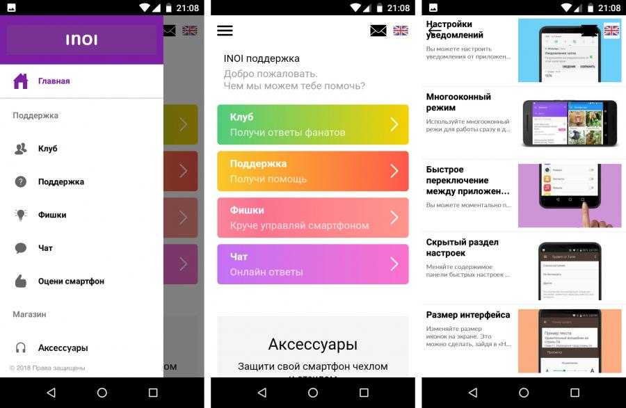 Если у вас возникли какие-либо вопросы по телефону, либо вы захотели узнать о не известных вам функциях смартфона, — запускайте предустановленное приложение INOI. Кроме этого, в приложении INOI вы сможете подобрать аксессуары для своего мобильного телефона (чехлы и корпуса, наушники и гарнитуры, карты памяти, стёкла на экран, аккумуляторы) и обратиться в тех поддержку.