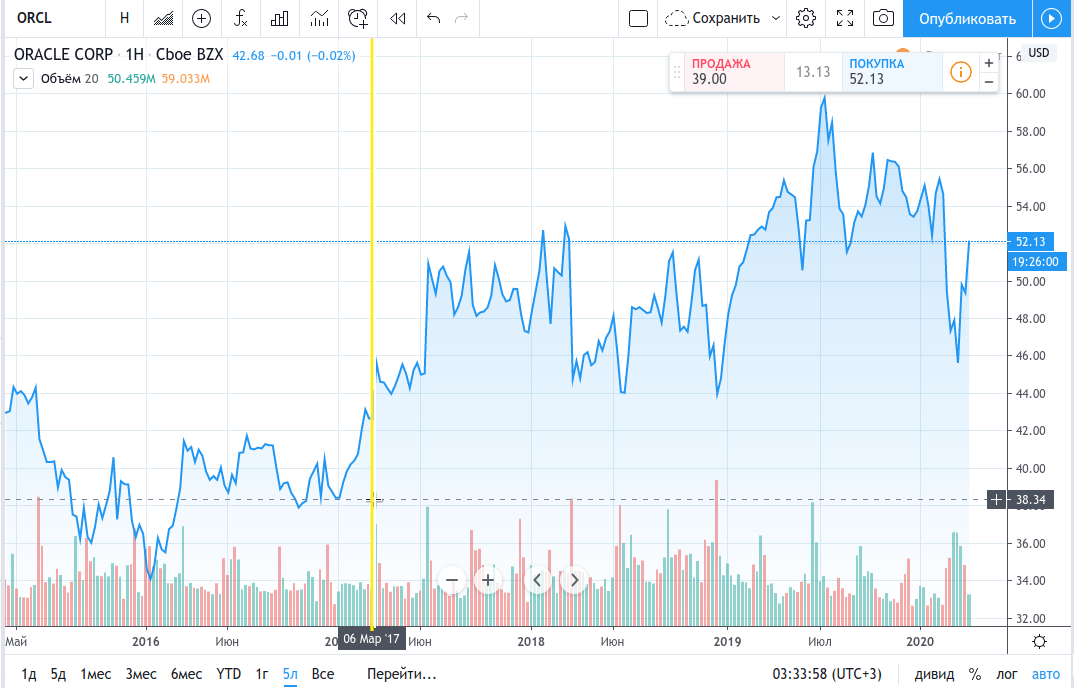 На графике видно, что ещё в марте Акции Oracle торговались на уровне трёхлетнего минимума, чуть выше, чем в 2017 году. Напомню, за это время основные конкуренты компании заметно прибавили в цене.
