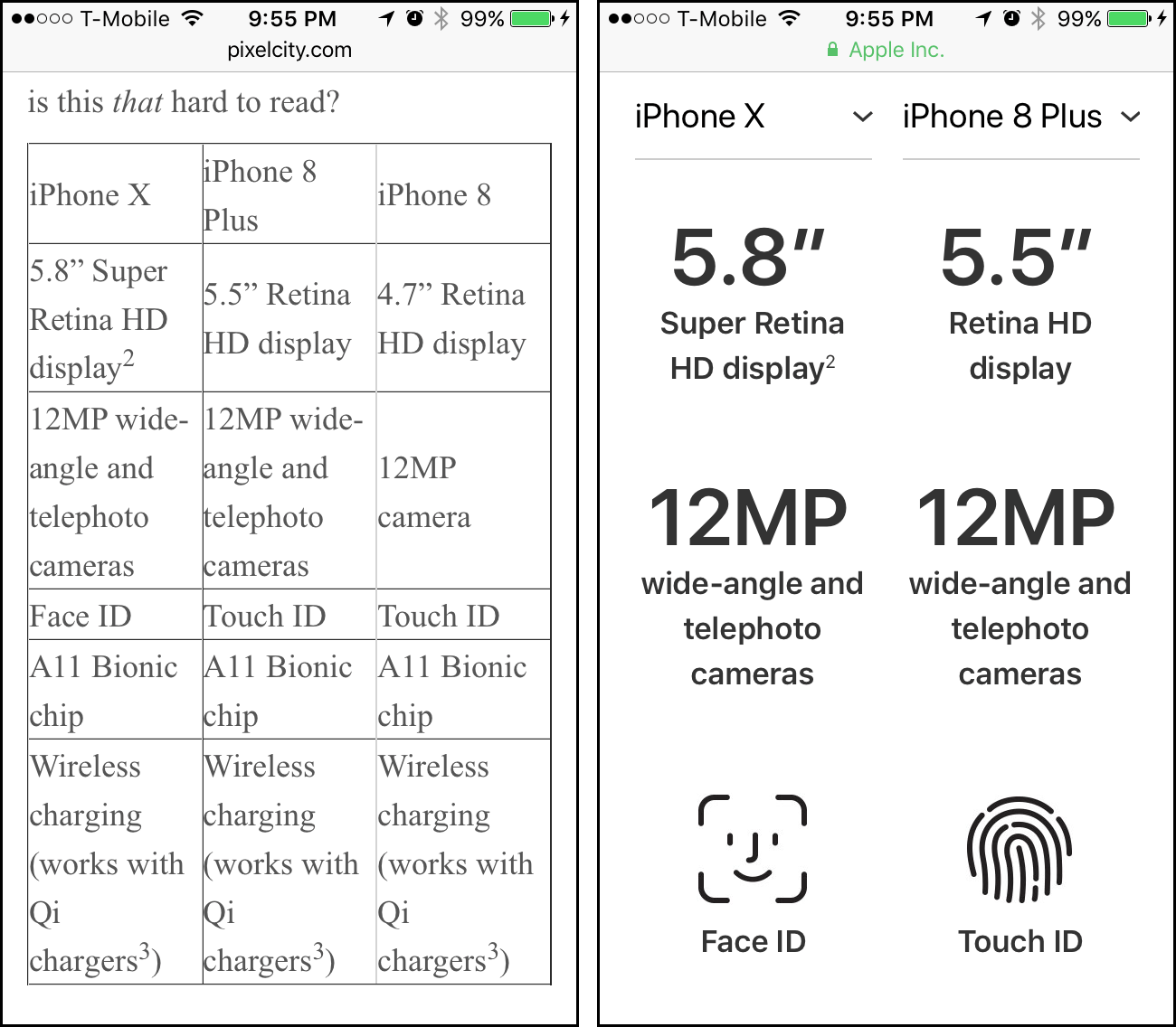 Also: that table shows up in its entirety on the 4″ screen of my iPhone 5S. The Apple page? Just three rows of icons — and just two columns.