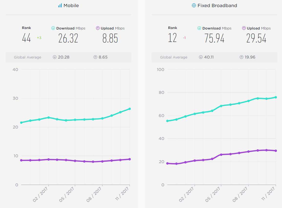 Ookla также показывает результаты, собранные в сервисе Speedtest. США – на 44 месте с результатом 26,32 Мбит/с (скачивание) и 8,85 Мб/с (загрузка). Ниже Латвии, Молдовы и Великобритании.
