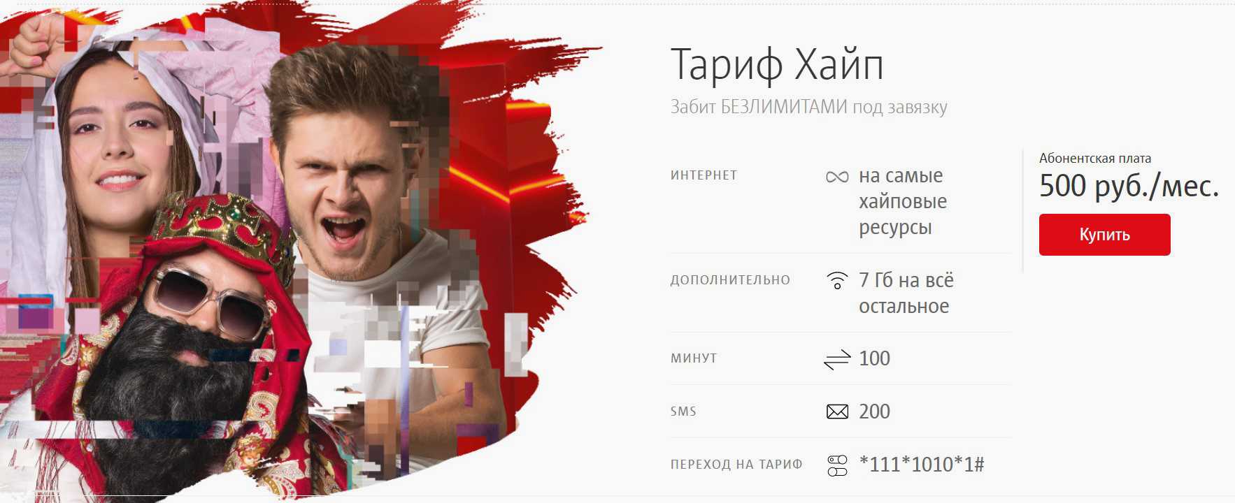 «Хайп» поинтереснее. За 500 рублей получаете 7 ГБ интернета и безлимит на хайповые ресурсы: «ВКонтакте», «Одноклассники», Facebook, Twitter, Skype, Telegram, WhatsApp, Viber, Snapchat, YouTube, МТС Music, Apple Music Google Music, Яндекс.Музыка, Zvooq, App Store, Google Play, МТС Connect, Twitch, World of Tanks Blitz, World of Tanks, World of Warships, War Thunder, Tanki X и Tanki Online, The Division, Rainbow Six: Осада, Skull and Bones (2018).