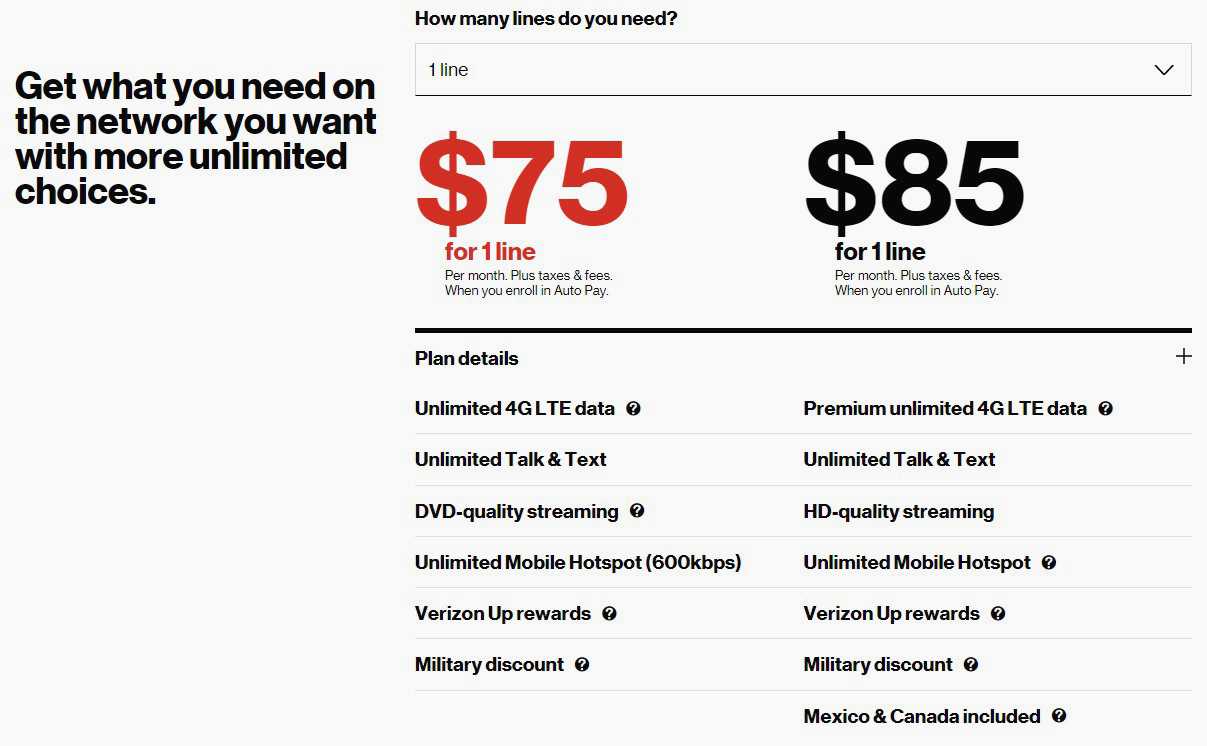 Verizon также абонентов не балует. Цены стартуют от 75 долларов в месяц за одну линию. И только если вы подключите автоматический платёж.