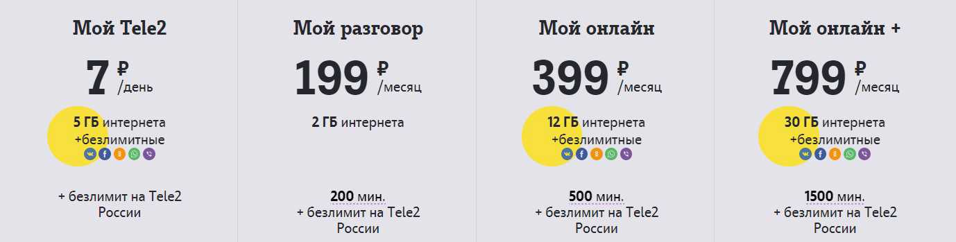 Tele2 за 7 рублей в день (0,123 доллара) предоставляет 5 ГБ интернета и безлимитные соцсети и мессенджеры. За 399 рублей (7 долларов) в месяц – 12 ГБ трафика, за 799 рублей (14 долларов) – 30 ГБ. Соцсети и мессенджеры также без ограничений. Ещё и остатки мегабайт, звонков и SMS переносятся на следующий месяц.