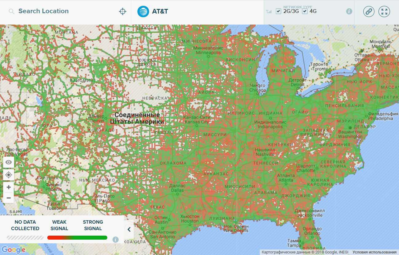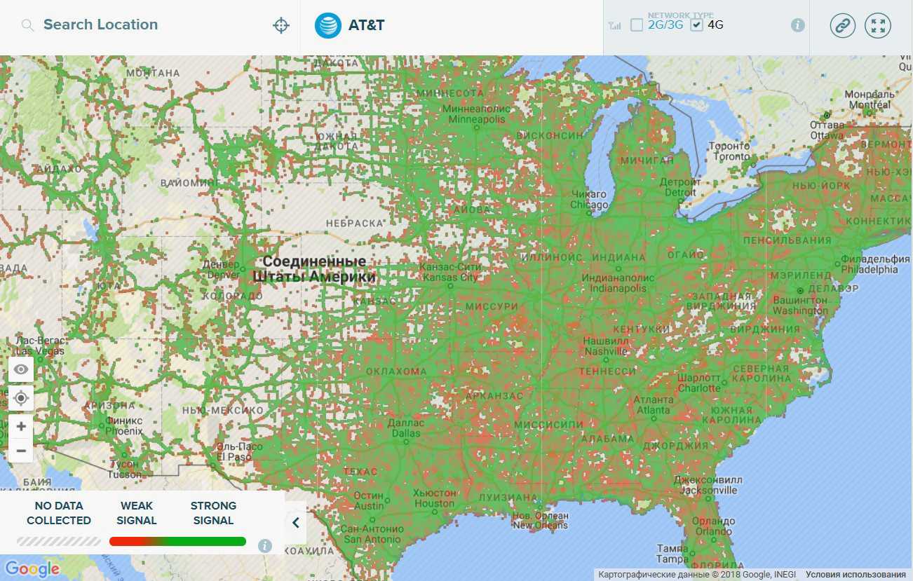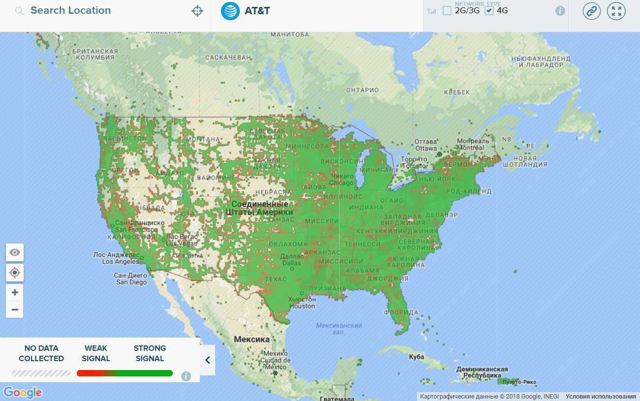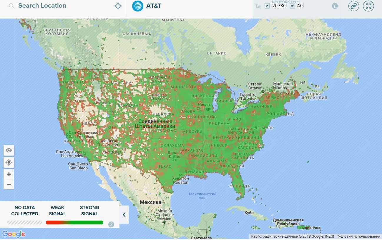 Всё тот же Open Signal даёт карту покрытия по странам. Для США картина не слишком радужная. Зелёным отмечены зоны с уверенным приёмом, красным – со слабым сигналом, цветом фона – места, где данные не собирались. Красных зон предостаточно. Вот, к примеру, данные для AT&T: