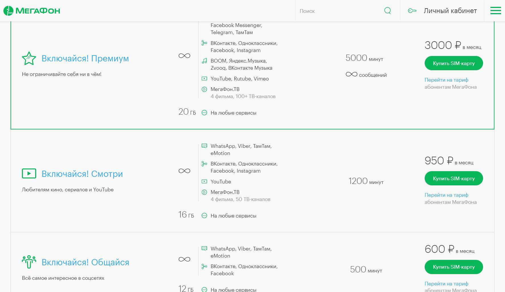 «МегаФон» за 600 рублей (11 долларов) в месяц предлагает безлимитные WhatsApp, Viber, ТамТам, eMotion, ВКонтакте, Oдноклассники, Facebook и 12 ГБ трафика на всё остальное. За 3000 рублей (53 доллара) вы получите 20 ГБ трафика на ресурсы, кроме WhatsApp, Viber, eMotion, Facebook Messenger, Telegram, ТамТам, ВКонтакте, Oдноклассники, Facebook, Instagram, BOOM, Яндекс.Музыка, Zvooq, ВКонтакте Музыка, YouTube, Rutube, Vimeo, МегаФон.ТВ (4 фильма, 100+ ТВ-каналов) – они бесплатные.