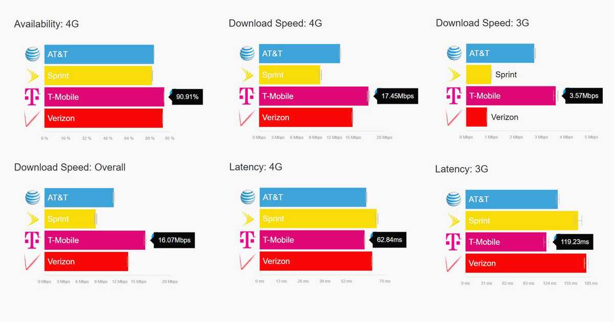 Победителем во всех «номинациях» стал оператор T-Mobile. Но и его результаты – так себе. Например, доступность 4G-интернета – 90,91%. У аутсайдера Sprint – 81,63%.