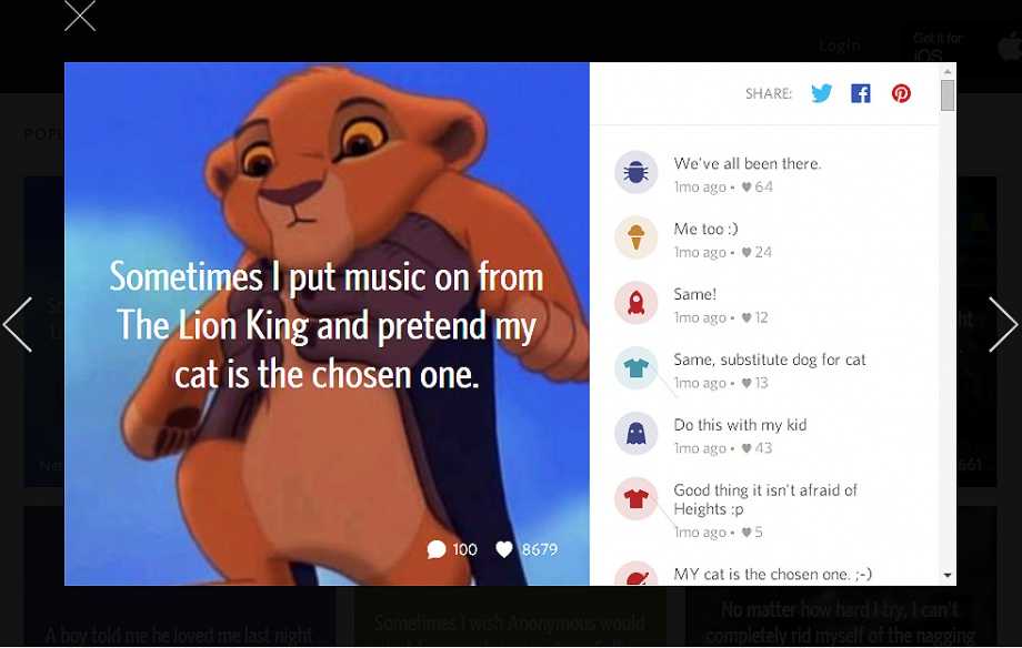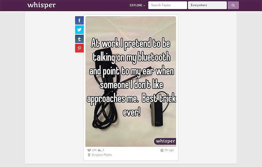 Whisper — это, можно сказать, прадедушка всех остальных аналогичных приложений, включая и Secret. «Шёпот» для Android и iOS появился два года назад, получил 36-миллионные инвестиции и может похвастаться миллиардами просмотров в месяц.