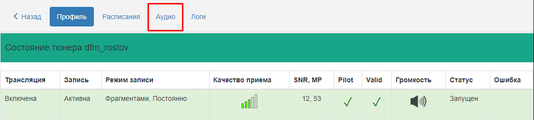 Данная страница содержит список записанных аудиофайлов выбранного тюнера. Для того, чтобы открыть страницу, надо в списке тюнеров выбрать нужный профиль, а затем нажать кнопку Аудио.