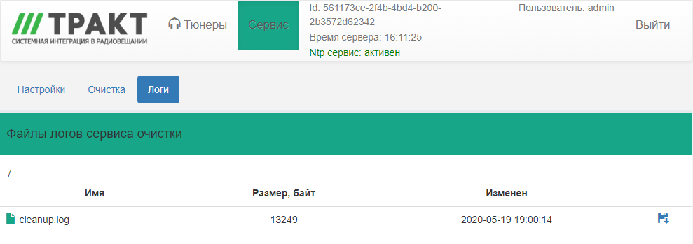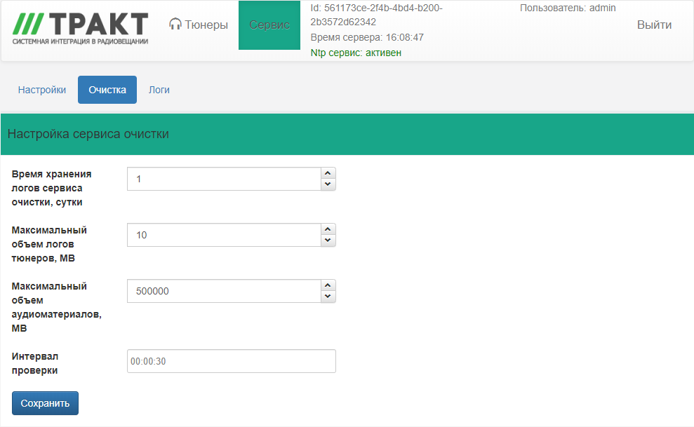 Время хранения логов сервиса очистки, сутки — период хранения лог-файлов сервиса очистки, в сутках.Максимальный объем логов тюнеров, MB — максимально допустимый объем лог-файлов для всех тюнеров, Мегабайт. Если суммарный объём файлов превысит указанное здесь значение, наиболее старые файлы буду удалены, а в лог-файлы будет выведено предупреждение.Максимальный объем аудиоматериалов, MB — максимально допустимый объем аудиофайлов для всех тюнеров, Мегабайт. Если суммарный объём файлов превысит указанное здесь значение, наиболее старые файлы буду удалены, а в лог-файлы будет выведено предупреждение.Интервал проверки — период проверки суммарного объема аудиофайлов (часы, минуты, секунды).