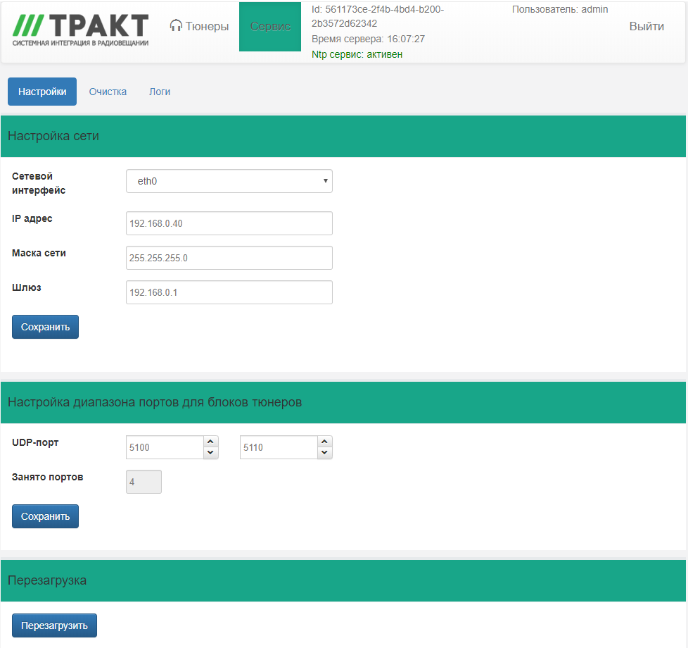 На этой вкладке можно выбрать используемый сетевой интерфейс и поменять его настройки, выбрать диапазон UDP-портов для блока тюнеров, а также отправить устройство на перезагрузку.
