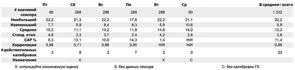 Рис.6: Пример сводной таблицы данных непрерывного мониторирования гликемии