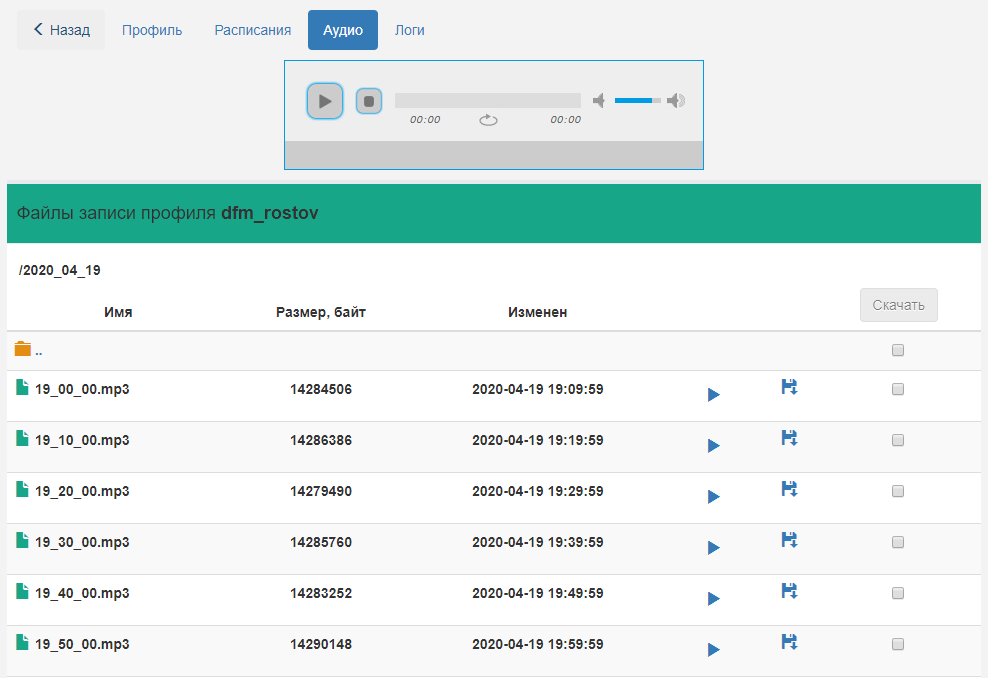 С помощью встроенного плеера любой файл из списка можно прослушать, а также скачать, нажав кнопку .