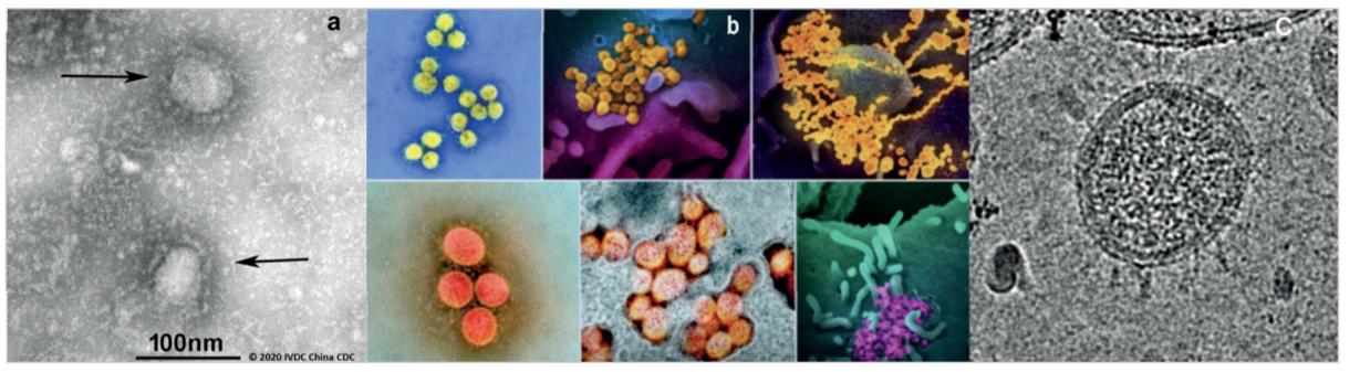 Источник.Первые реальные изображения SARS-CoV-2: NMDC (a); NIAID (b), Cryo-EM Centre, Shenzhen, China (c).