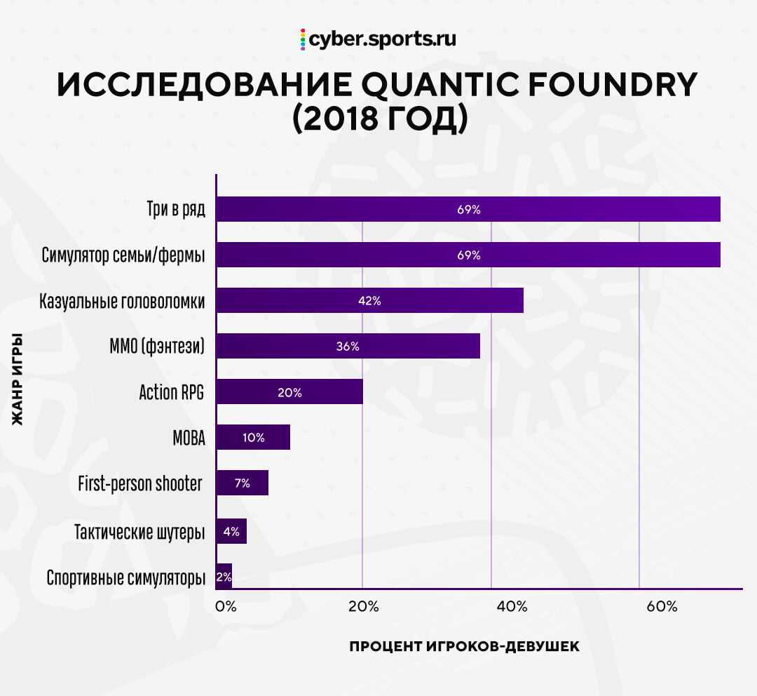 В 2017 году Quantic Foundry провела более глубокое и осмысленное исследование. В их опросе приняли участие более 270 тыс. геймеров – и только 18,9% из них оказались женщинами. Опрашиваемых попросили указать до 9 любимых игр, чтобы составить рейтинг популярности жанров. И здесь вскрылся главный нюанс: большинство девушек, увлекающихся видеоиграми, любят казуальщину по типу «три в ряд», симулятора фермы или просто головоломок. Но их все равно (и вполне справедливо) причисляют к геймерам. В MOBA оказалось всего 10% игроков женского пола, в шутерах, а уж тем более спортивных симуляторах – еще меньше. Это значит, что в киберспортивных играх не каждый третий игрок окажется девушкой, а в лучшем случае каждый десятый.