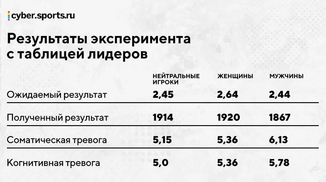 Первой группе показывали таблицу, в которой на лидирующих позициях находили игроки с мужскими никами и аватарами (то есть девушки считали, что соревнуются с парнями). Другой группе показывали список лидеров, состоящий из женщин. Контрольная группа видела таблицу с нейтральными никнеймами.