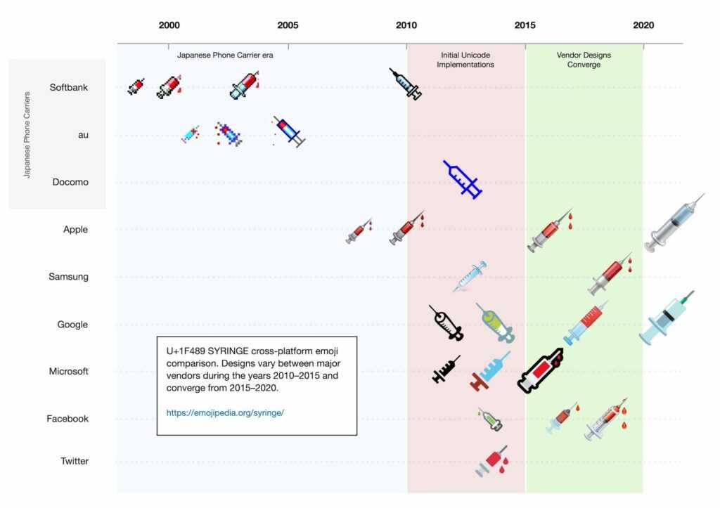 В движении , что видел глобальные новости покрытия , когда она впервые появилась в прошивкой 14,5 бета 2, то Шприц не Emoji больше не отображает никакой крови, и теперь имеет более короткую иглу и более серый ствол.