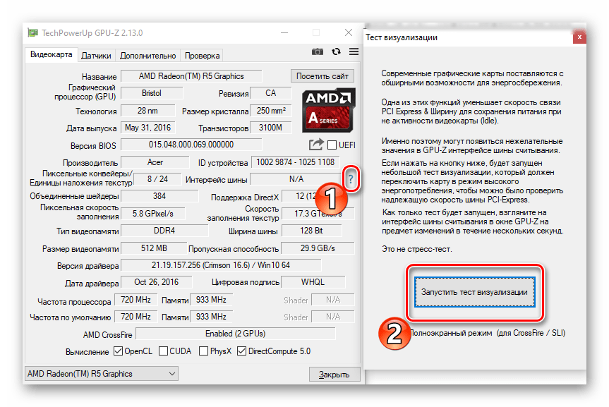 В этой же вкладке выполняется диагностика визуализации. Это не стресс-тест на производительность видеокарты, а проверка максимальной скорости ее шины. Для этого система переключает адаптер в режим высокого энергопотребления. Чтобы запустить функцию, необходимо кликнуть на знак вопроса справа от пункта «Интерфейс шины» и нажать на кнопку «Запустить тест визуализации».