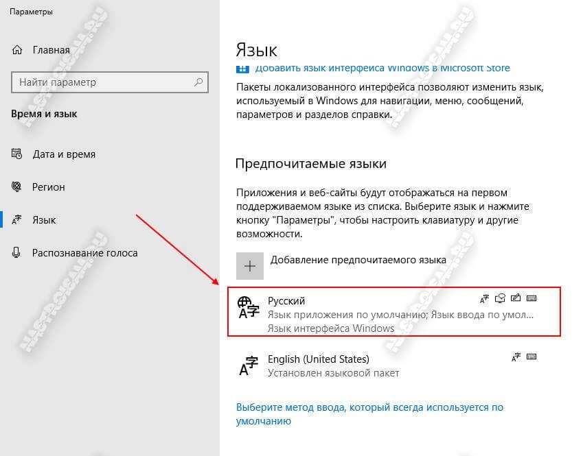 Кстати, попасть сюда можно и через Параметры системы, открыв раздел «Время и Язык». В нижней части окна будут отображены предпочитаемые языки. Как правило, в нашей стране, это русский и английский. Как Вы видите, по умолчанию выбран Русский, о чем стоит соответствующая пометка — «Язык приложения по умолчанию».