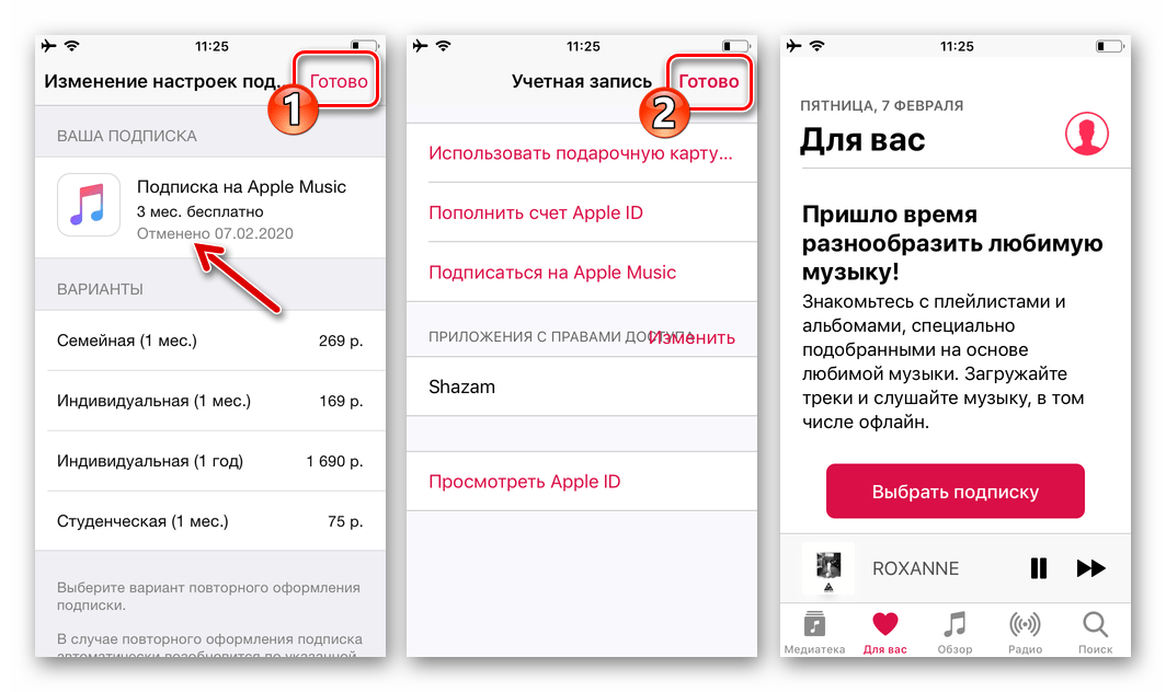 На этом операция по отмене подписки в музыкальном сервисе Эппл Мьюзик завершена, а в её результативности можно убедиться по появившейся под наименованием услуги отметке «Отменено» или «Заканчивается: ДАТА» — в зависимости от задействованного варианта (бесплатный/платный) доступа в сервис. Дважды коснитесь «Готово» вверху экрана справа, после чего программу Музыка можно закрыть либо продолжить её использование.
