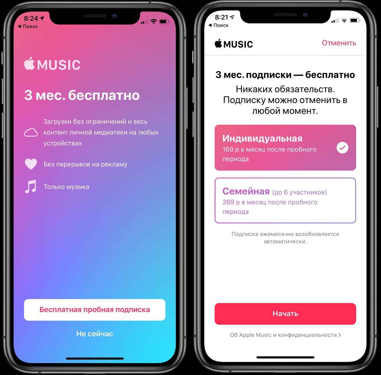 Чтобы начать пробную подписку, к вашему Apple ID должна быть привязана денежная карта. Вам придётся подтвердить «покупку» платной подписки, но не переживайте – действительно платить вам не придётся. Есть три варианта подписки Apple Music: индивидуальная (169 р/месяц), семейная (269 р/месяц) и для учащихся (75 р/месяц). Кроме того, можно получить специальное предложение бесплатной подписки Apple Music от МТС на 6 месяцев.