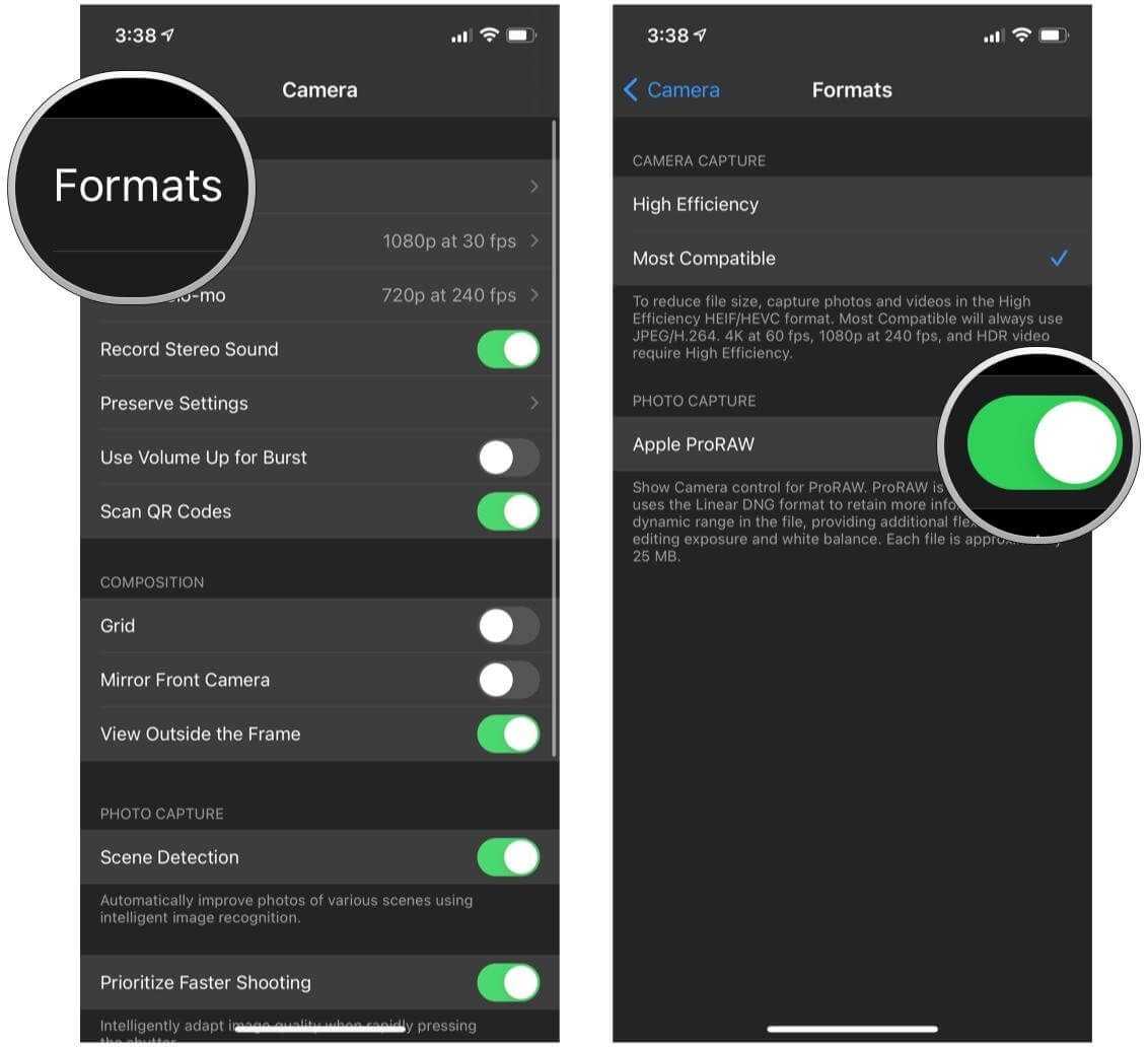 Если вы используете iOS 14.3 или выше, вы также можете выбрать Apple ProRAW, которая сохраняет ваши фотографии в формате RAW, чтобы сохранить их исходное качество, хотя при этом требуется больше места для хранения.