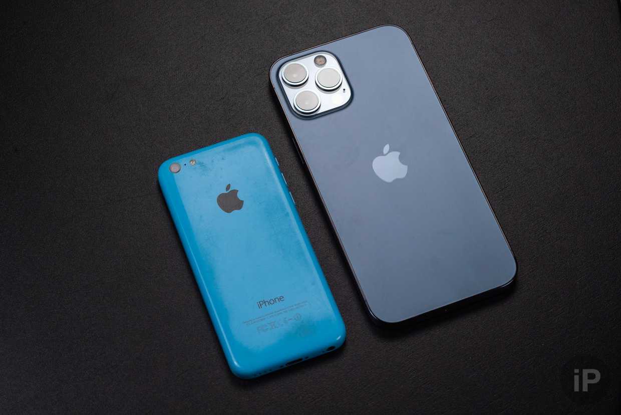 В этом плане почти чудо то, что огромный дисплей диагональю 6,7 дюйма уместился в iPhone 12 Pro Max при той же ширине, что и у 5,5-дюймового iPhone 7 Plus за счёт нового дизайна.