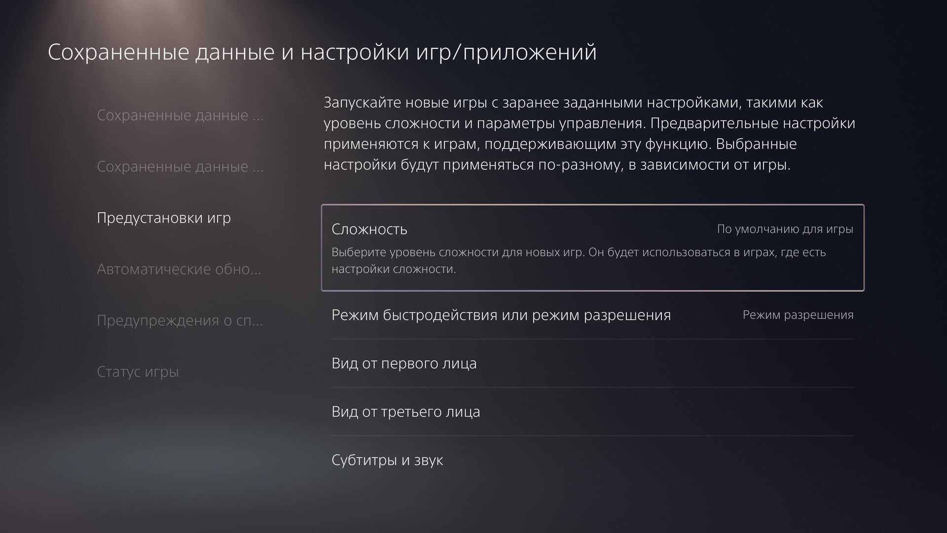 Принципиально новая фишка – предустановки игр. Это отдельная вкладка настроек, в которой можно задать предпочтения по сложности, отдать приоритет режиму производительности или графики, задать язык игр и включить или выключить субтитры. То есть при первом запуске новой игры она уже будет выглядеть и звучать так, как нужно, но только если разработчики позаботились о поддержке функции.