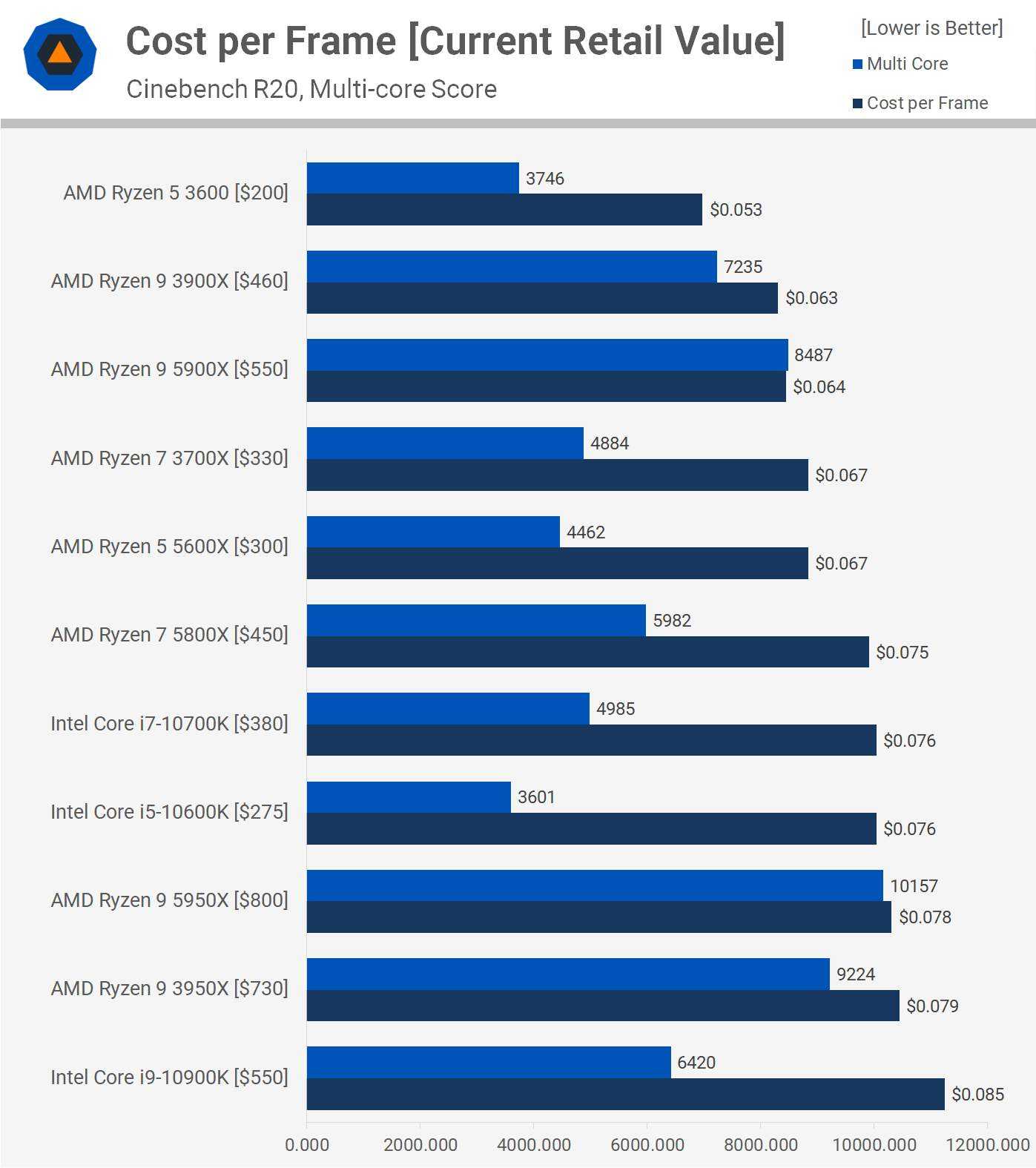 Для игр в пересчёте на кадр 5800X обходится чуть дороже по сравнению с 3700X, несмотря на рост производительности в 28%. Также он проигрывает по своей ценности Core i7-10700K, хотя проявляет себя лучше, нежели 5900X, поскольку большинство игр не могут задействовать дополнительные ядра.