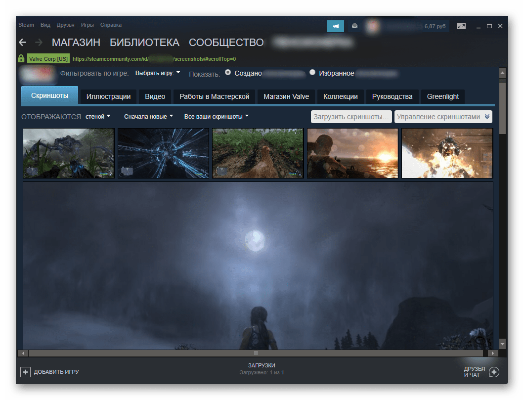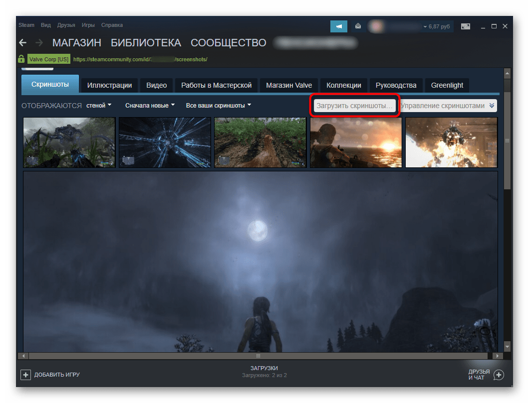 - Далее, вы можете выбрать какое-то изображение и в правой части экрана нажать «Загрузить». После этого начнётся загрузка в облако Steam Cloud и фото станет доступным вашим друзьям.