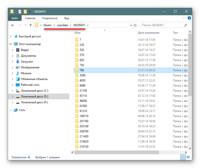 - Через папку Steam. Проследуйте по этому пути: Х (диск):Steamuserdata. Там вы увидите числовые названия папок, откройте такую папку и далее выберите одну из папок с названием в три цифры.